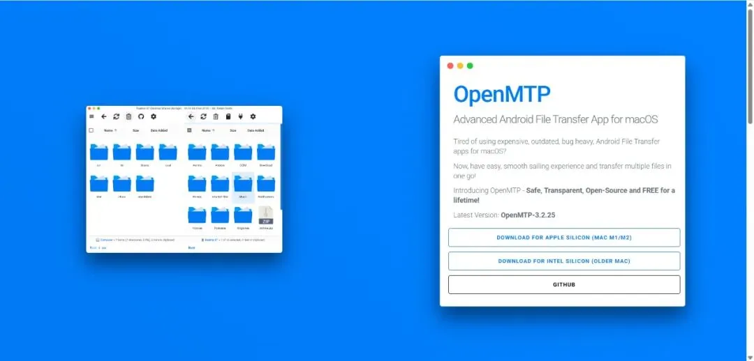 直接访问项目的官网 openmtp.ganeshrvel.com,或者去 GitHub 的 Releases 页面,根据你的 Mac 是 Apple Silicon 芯片(M1/M2/M3...)还是 Intel 芯片,下载对应的 .dmg 安装包,然后拖入“应用程序”文件夹即可。