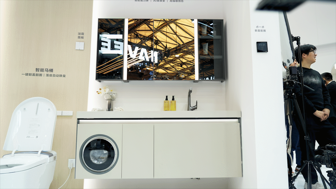 展会现场,九牧智能魔镜柜凭借领先的智慧交互体验成为焦点。该产品内置15.6英寸智慧魔力屏,搭载华为Cast Engine技术,用户手机一碰即可投屏,可随心设定显示天气预报、日程提醒、聊天追剧等内容。魔镜柜不仅“懂你所想”,更能“随你而动”:智能感应调光系统可根据人与镜面的距离自动切换亮度,靠近即亮、远离渐隐,配合智感除雾、刷牙指导等功能,真正实现了镜、光、屏、声AI全维协同。