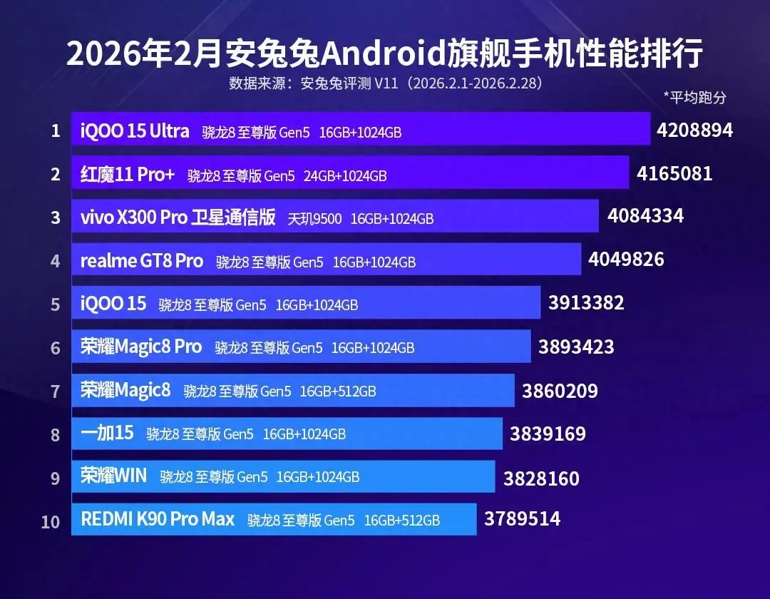 今天分享2月安兔兔安卓旗舰性能榜,最大的改变是红魔11Pro+跌至榜单第二名,国产新黑马诞生,它就是为极致玩家而生的iQOO15 Ultra。和1月性能榜相比,榜单第一名的平均成绩提升了10万分左右,称其为国产新黑马没问题吧。在分享榜单机型的同时,亓纪依旧会附上该机的优缺点和到手价格,希望对大家的购机有所帮助。