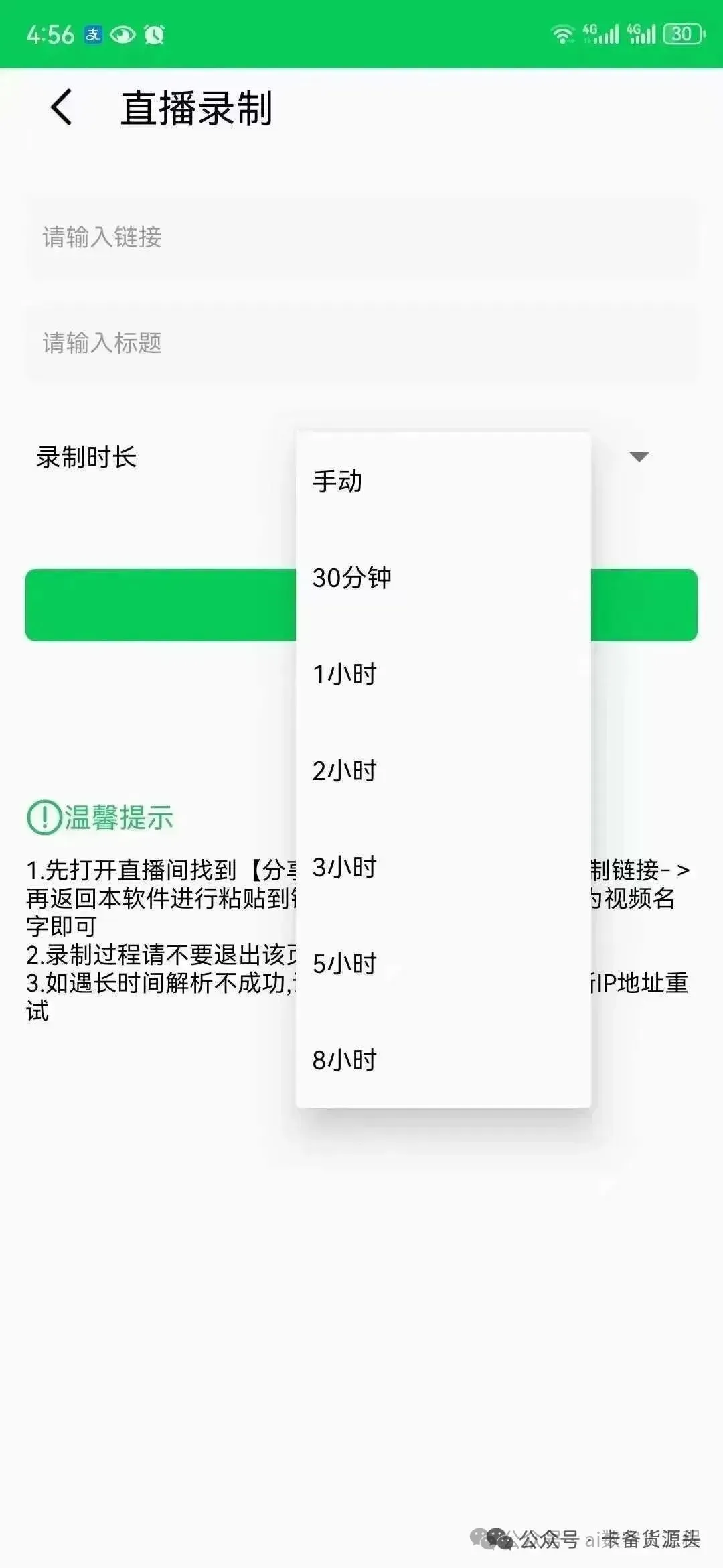 通过分享其他人直播间链接,复制粘贴到链接位置,填写标题,设置好录制时间!点击开始即可!