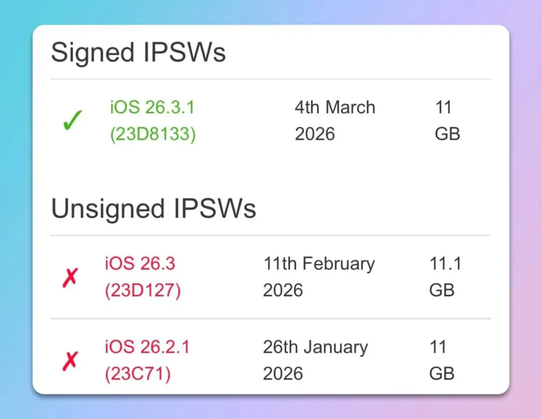 这意味着,如果你更新至更高版本的系统后,已经无法再降级至 iOS 26.3 正式版系统了。