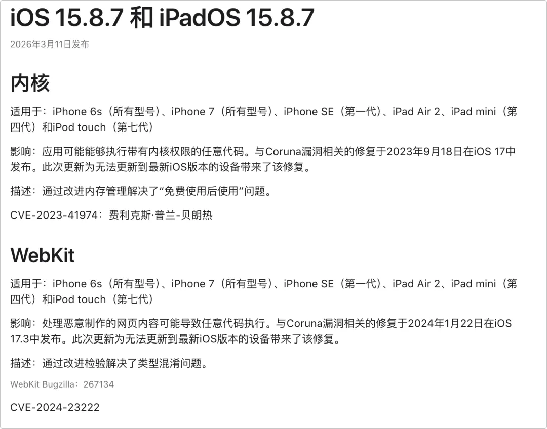 同步推送的第二款系统,是iOS15.8.7及对应iPadOS版本,主要面向更老旧的设备,堪称“古董机福利”。
