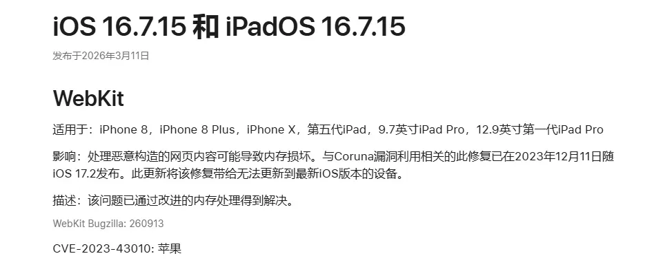 在 iOS 16.7.15 和 15.8.7 安全内容官网可见,这里就提到修补一个 WebKit 漏洞,CVE是 CVE-2023-43010,此漏洞就是 Safari 网页漏洞,也是与Google上周披露的 Coruna 漏洞有关,所以紧急修复。