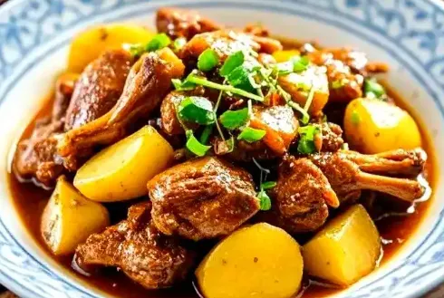 土豆焖鸭肉、三色炒瘦肉、米饭