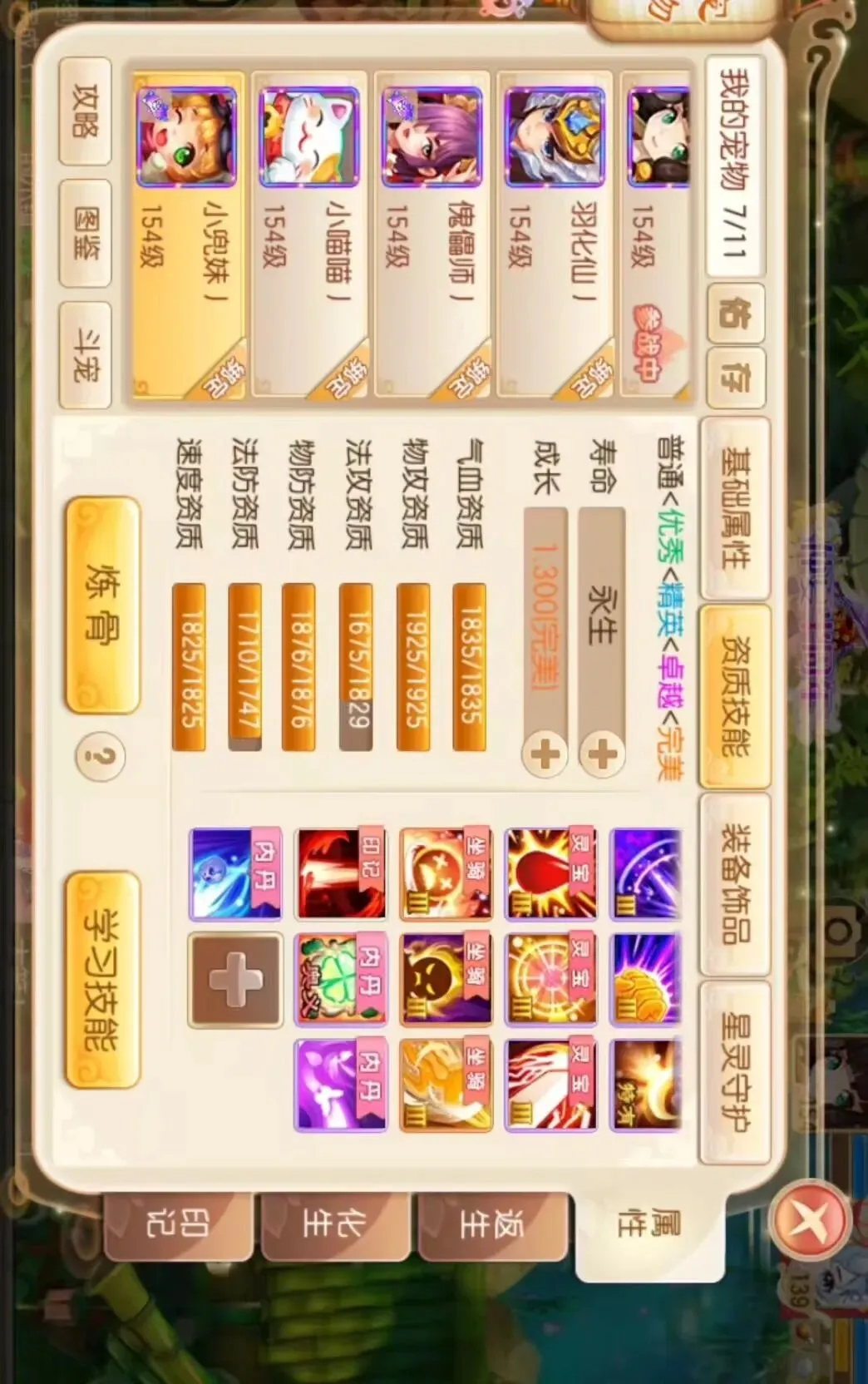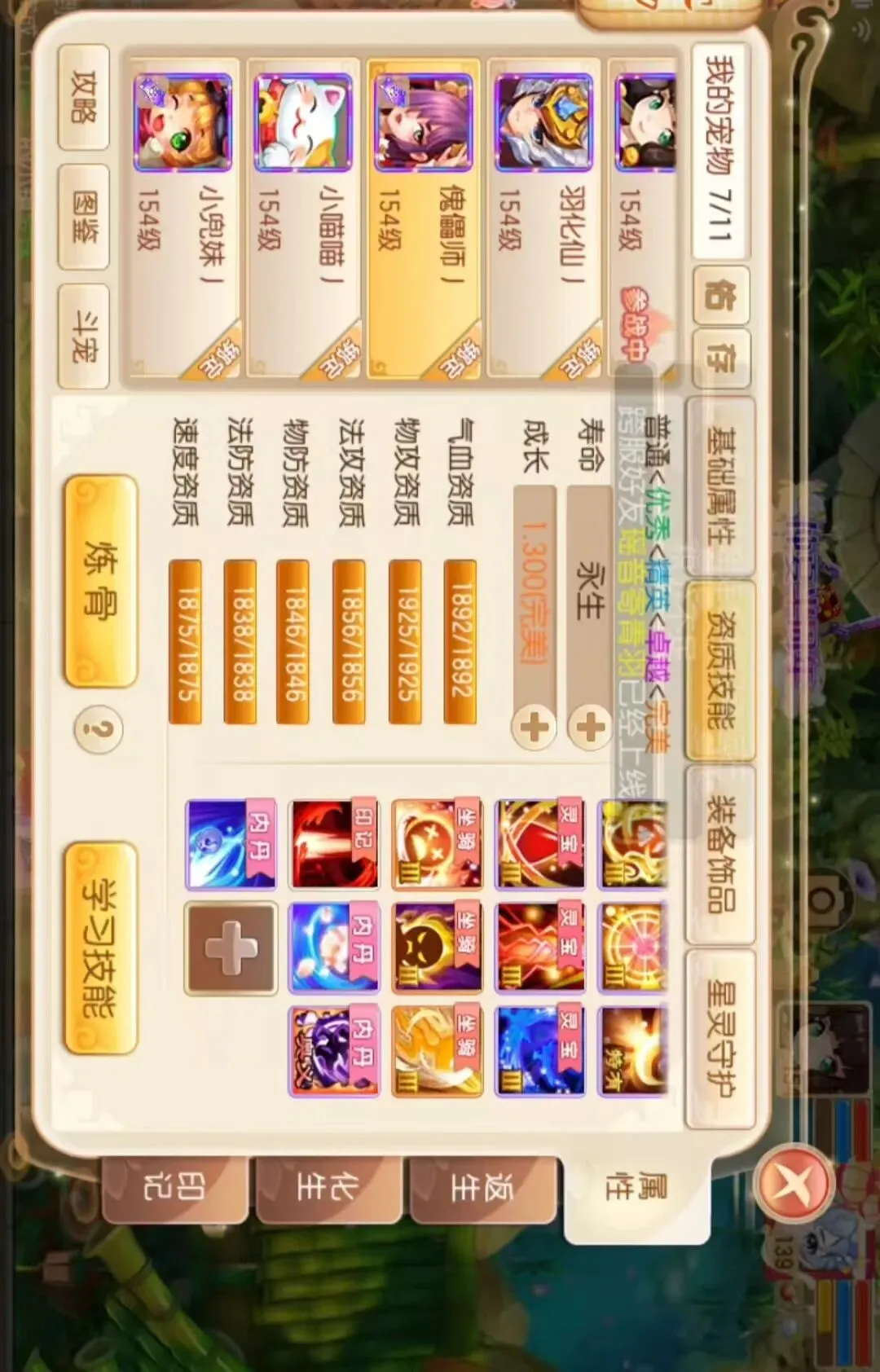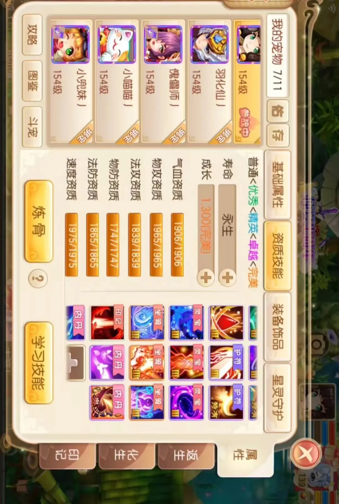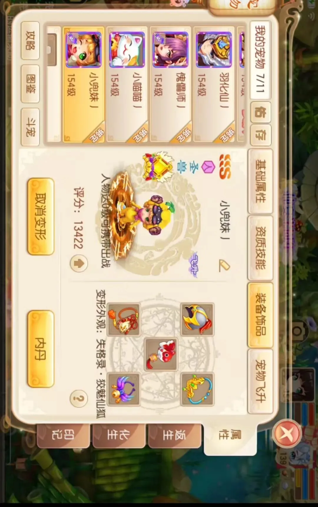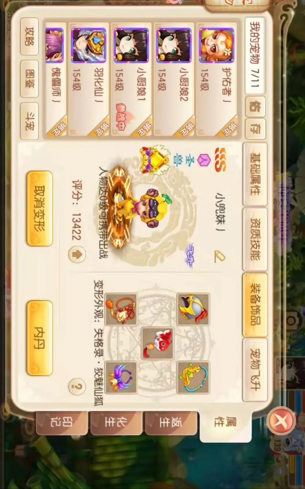 宠物:厨娘、兜妹、羽化仙、傀儡师满阶带奥义,额外一只厨娘,喵喵酱。
