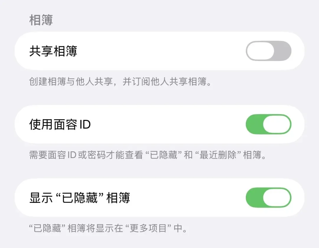 - ·照片加密:在“设置”-“照片”中可以开启“使用面容ID”功能,这样隐藏相册和“最近删除”相册就需要通过面容ID 解锁才能查看,隐私保护再升级。