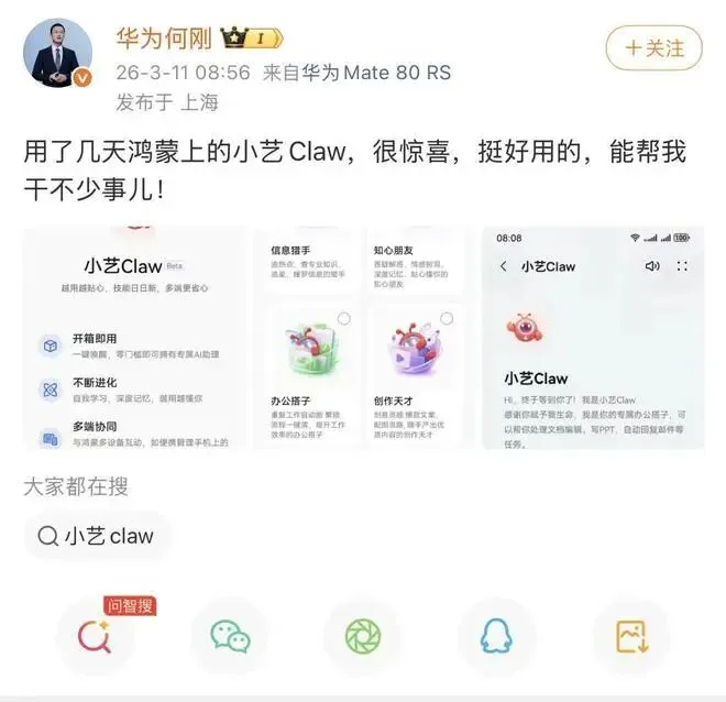2026年开年,AI圈最火的莫过于“龙虾AI”——以OpenClaw为代表的开源智能体,凭借主动执行、本地部署、持久记忆迅速出圈。正当行业热议“谁先把龙虾装进手机”时,华为用一场低调却重磅的落地给出答案。3月11日,华为终端BG CEO何刚公开实测小艺Claw Beta版,直言“很惊喜,挺好用,能帮我干不少事儿”。这不仅是鸿蒙生态的一次关键升级,更标志中国终端AI从“被动问答”正式迈向主动干活、全场景协同的新阶段。