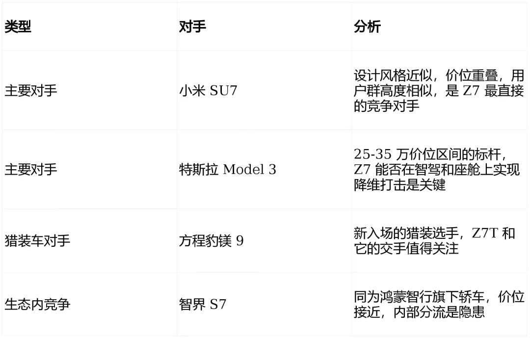 这个缺口,就是 Z7 要填的。而余承东在 3 月 4 日的技术焕新发布会上直接给它贴了标签:鸿蒙智行"最年轻的车"。这话的潜台词很明显——这台车的目标用户就是正在对小米 SU7 犹豫的那一批人。