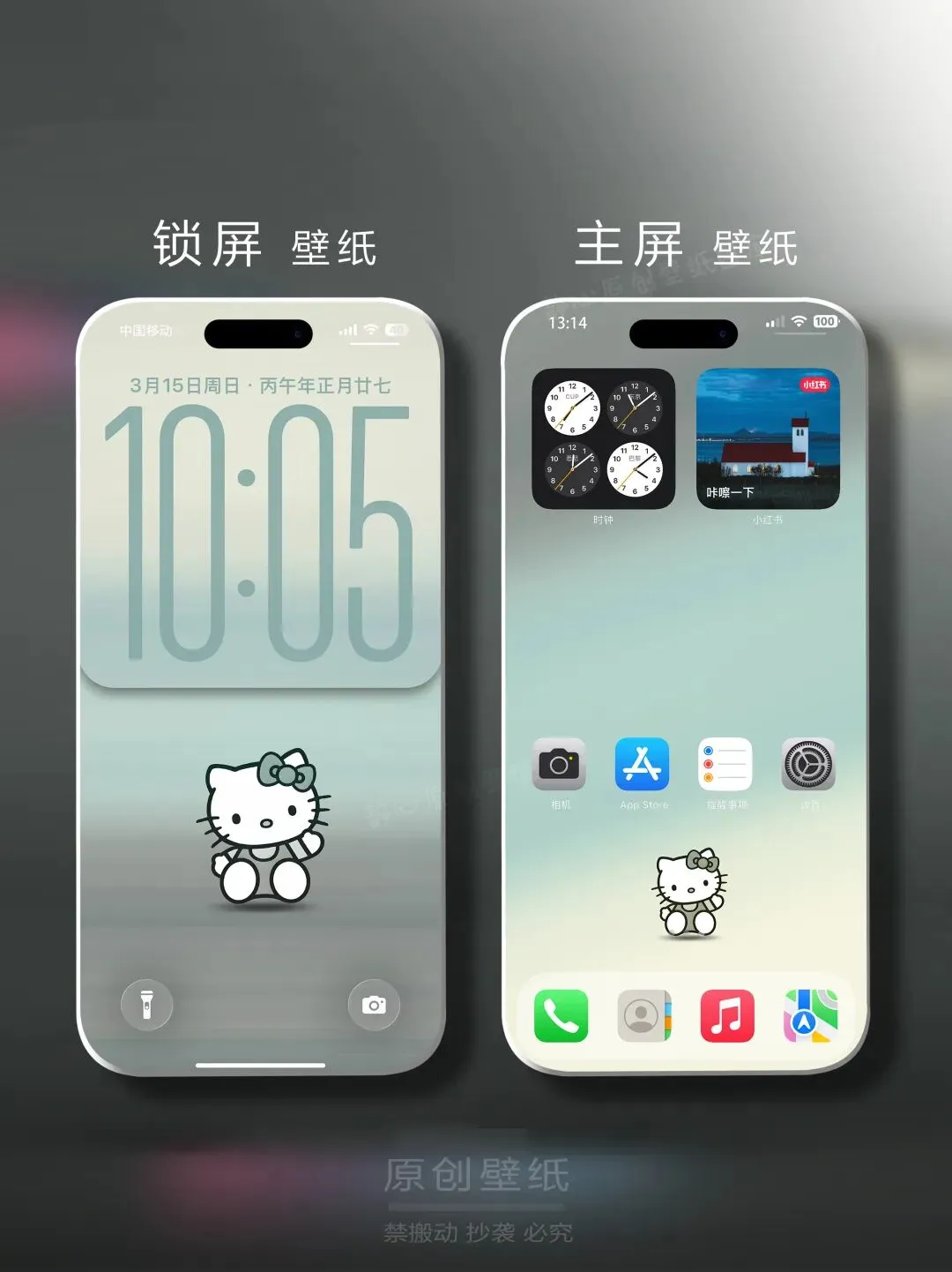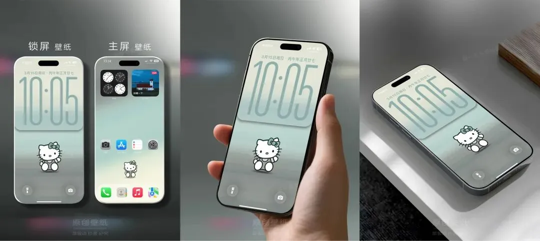 >素雅灰古韵柔和HelloKitty ios26简约趣味手机壁纸
