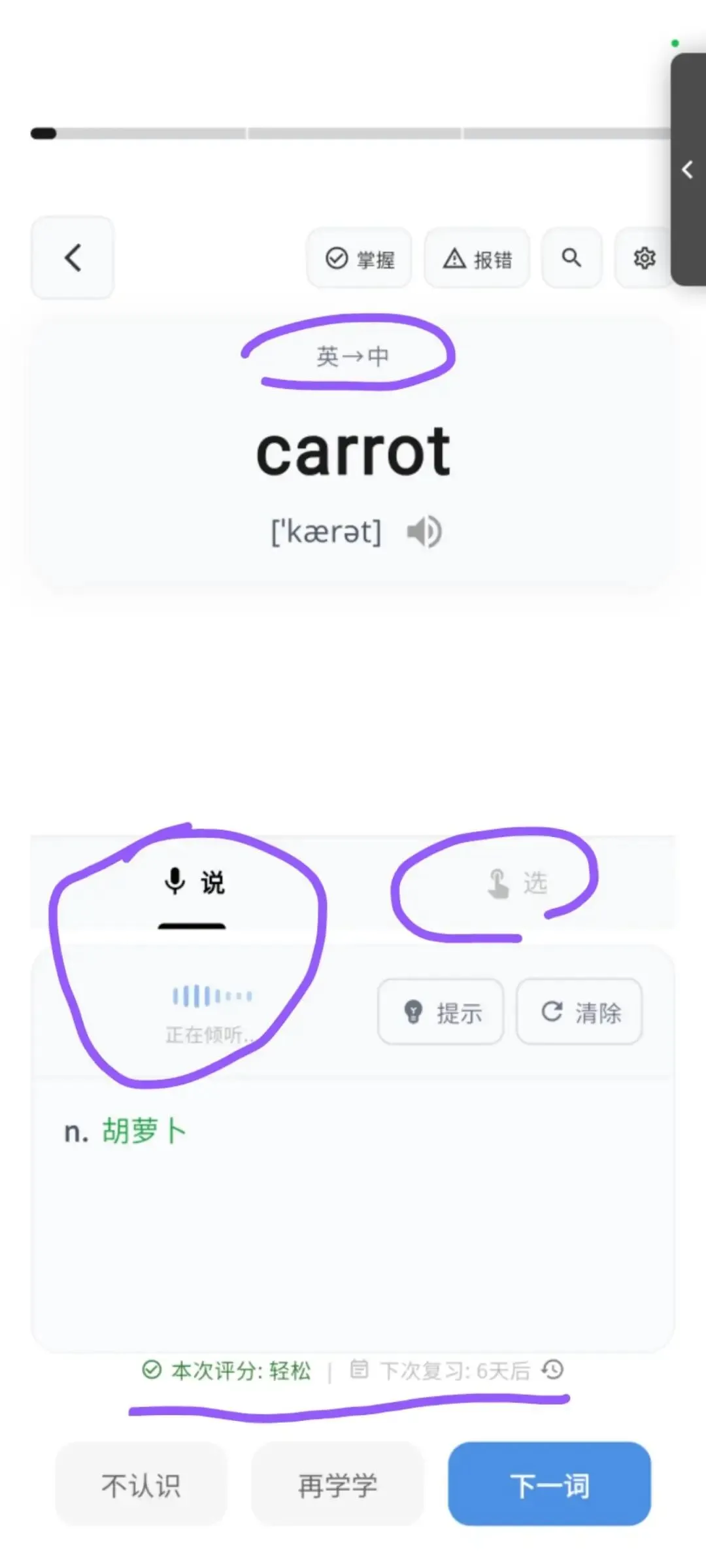 如果不想语音也可以选择选词意,而且不仅有英文选中文,还有中文选英文检测。而且它是根据选择词义停留时间而自动识别熟练程度的,可以避免背单词时作弊哦~会根据熟练程度,自动制定复习时间的呦~