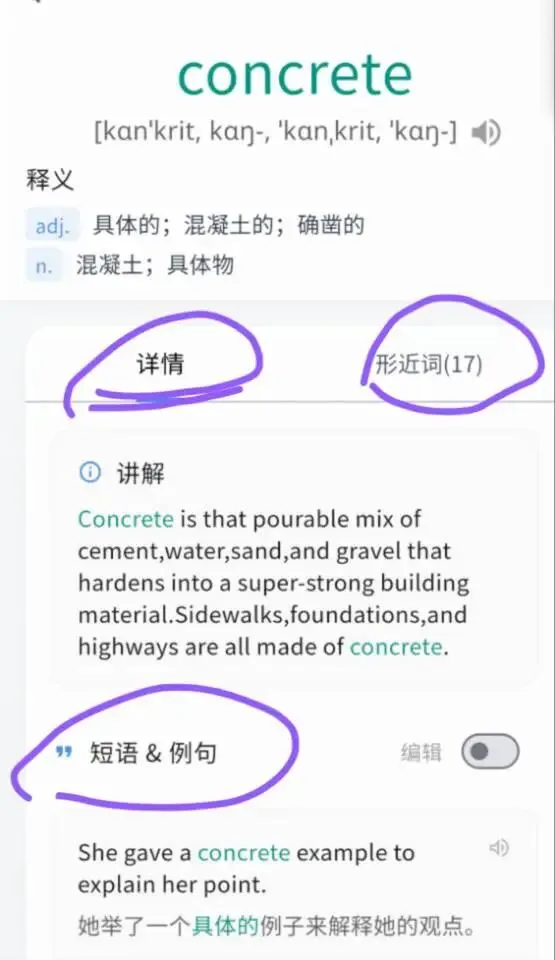 它含有常规单词软件拥有的单词详情讲解、短语例句、相关形近词。