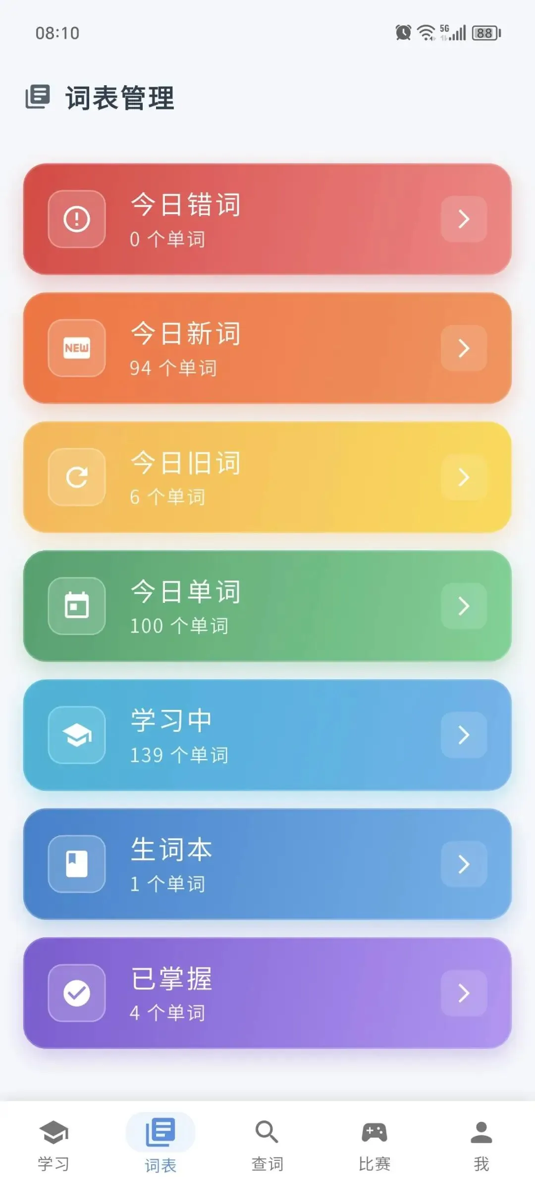 还有词表可以看自己的学习情况,这里也可以直接列表似背单词。单词是否掌握是自己在词表这里选择确定的哦,不是背完就自动识别的,那些还不熟悉但是蒙对的词也不用担心不能再学习啦~