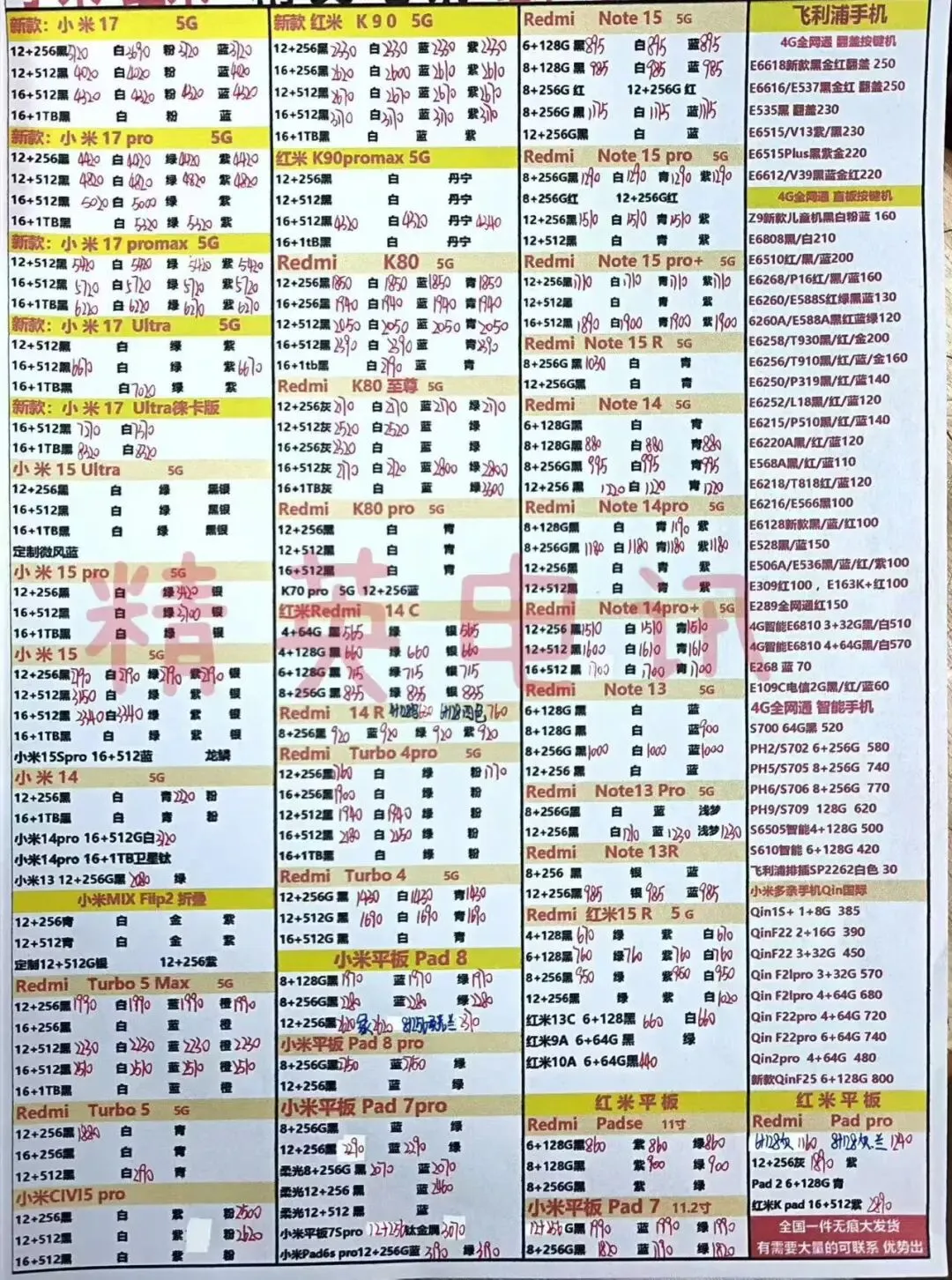 以下报价都是深圳华强北手机批发市场当天的最新批发价格(不含税),报价是我们的批发底价,零售拿货价格需加20~100元不等,京东包邮(量大价格可谈)