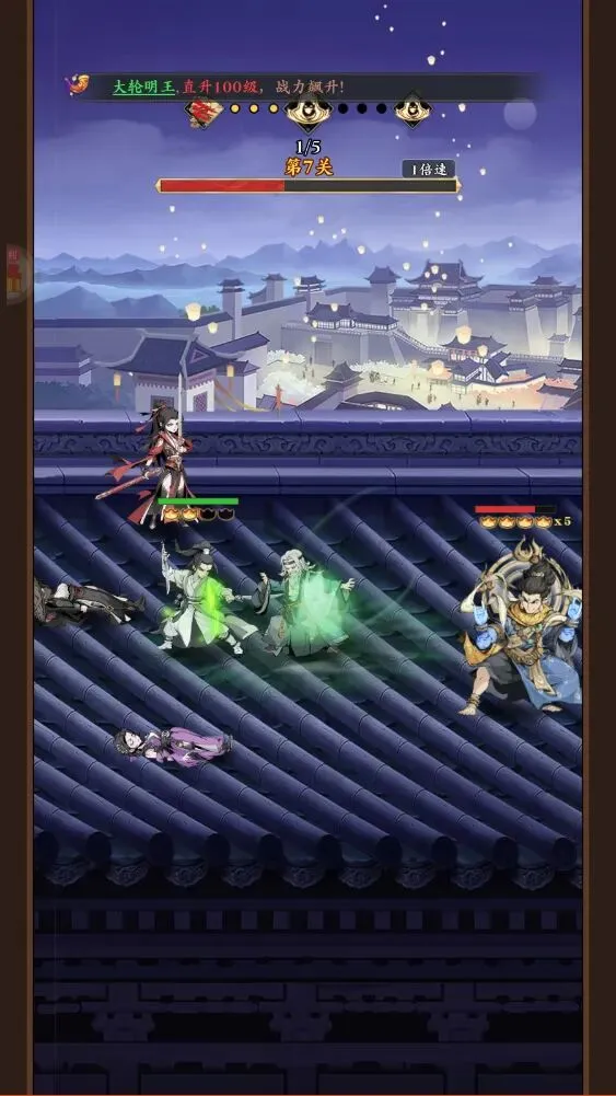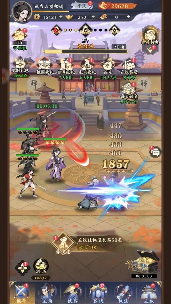 1、进入到雪刀群侠传0.1折版本后先手动点击屏幕进行闯关战斗,简单完成几个任务后就会解锁自动战斗道具了,这样可以的伤害和速度属性