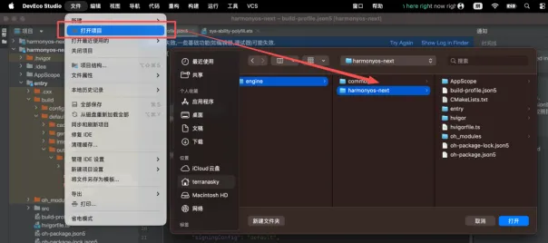 1. 打开工程:启动DevEco Studio,选择「文件→打开项目」,打开对应版本cocos 构建的鸿蒙工程。