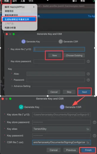 2. 签名配置(上架必备):① 生成密钥:点击「构建→生成私钥和证书请求文件」,生成.p12私钥文件和.csr证书请求文件;