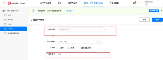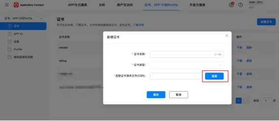 ② 申请证书:登录AGC平台「证书管理」,上传.csr文件,获取发布证书(.cer)、使用申请的证书申请profile;
