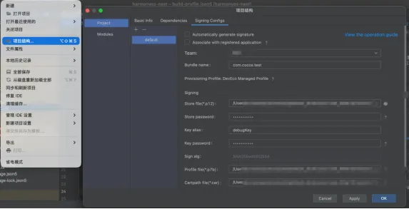 ③ 配置签名:文件→项目结构→Signing Configs 填写别名密钥,配置对应的p12、csr,以及使用它们申请的证书文件和profile并将配置好的Signing Configs 配置到product。