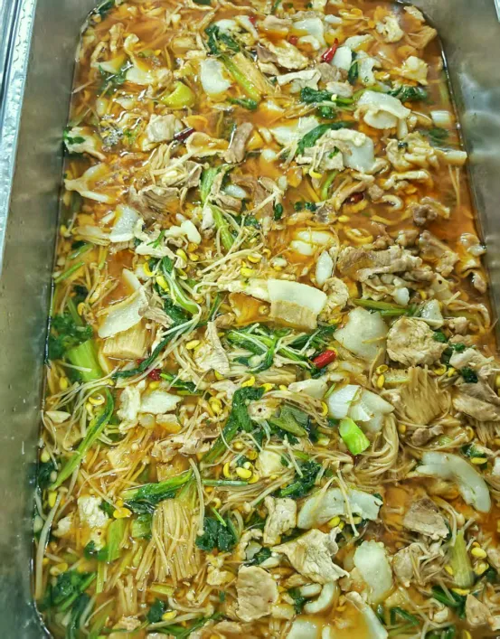 菜品:辣子鸡 水煮肉片 奥尔良鸭块 蒸鸡蛋糕 蒜苔肉丝 腐竹花生
