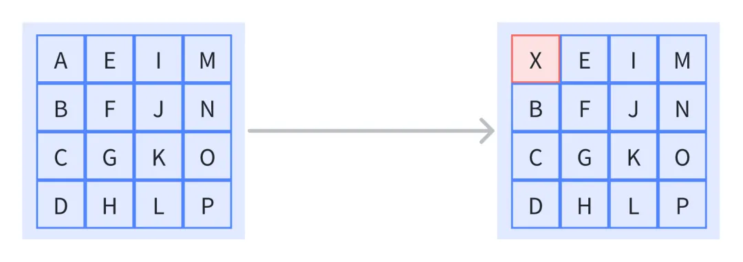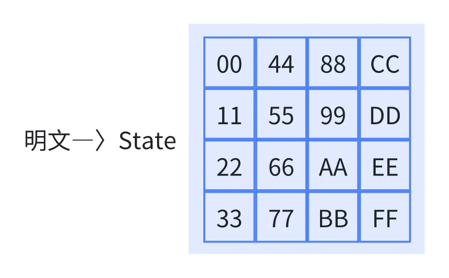 AES 算法中,数据以 state(状态矩阵) 的形式进行计算和传输。明文按从上到下、从左到右的顺序填入 4×4 的状态矩阵: