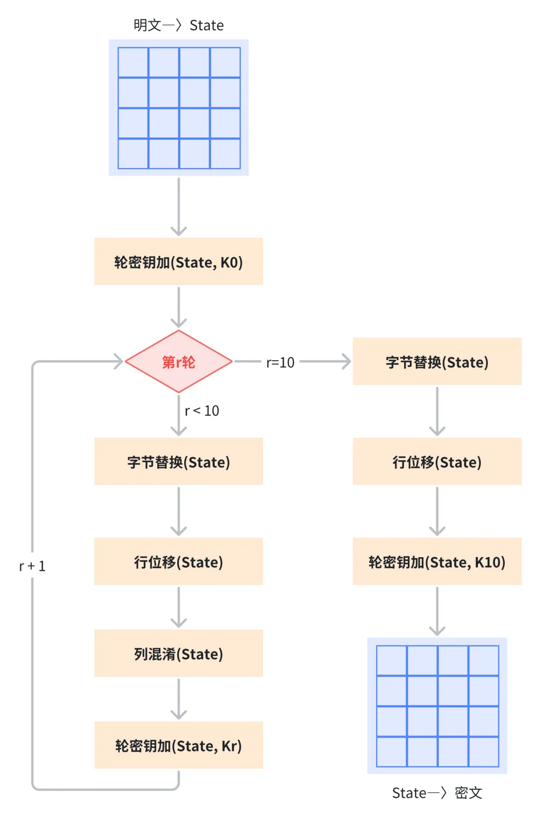 AES-128 加密流程图如下: