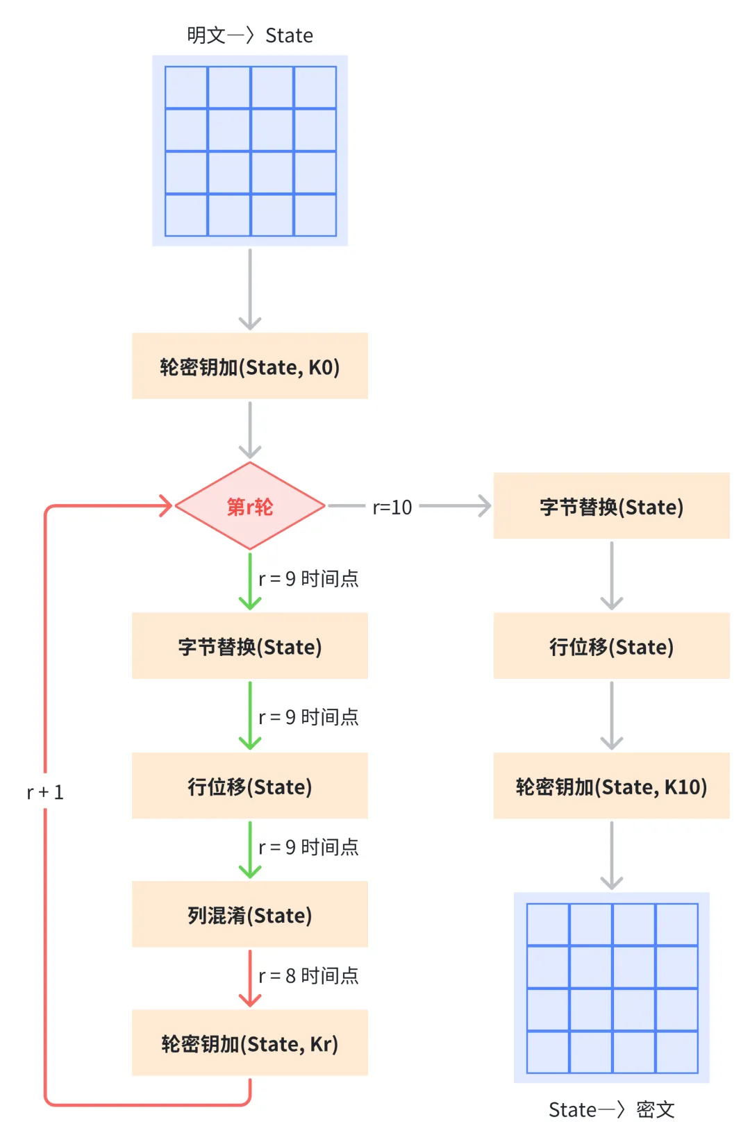 - 明文处理包含一次初始轮密钥加,加上 10 轮主运算