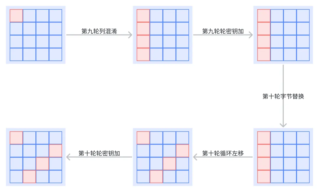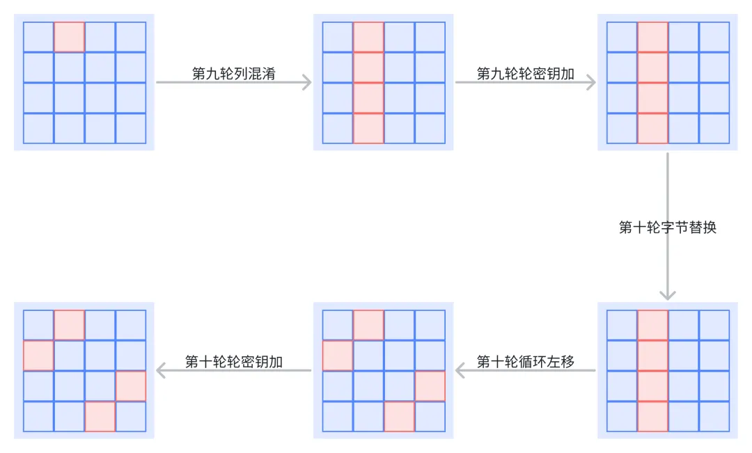 初始轮密钥加K0十轮运算流程如下(注意第 10 轮没有列混淆):