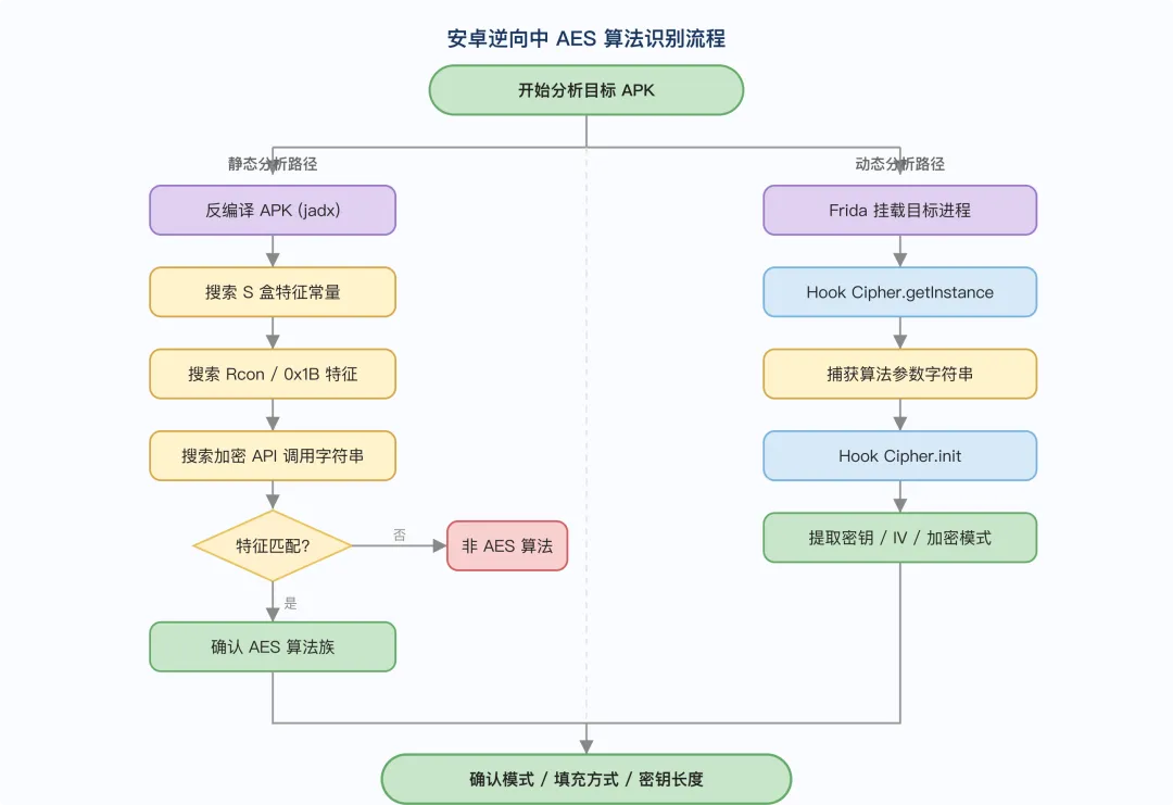 安卓逆向识别技巧:可通过循环轮数区分版本——10 轮为 AES-128,12 轮为 AES-192,14 轮为 AES-256。