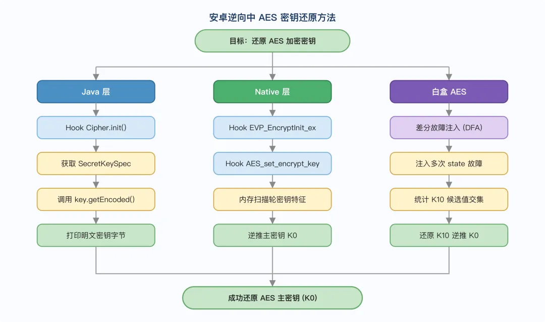 总结:本文从 AES 基础原理出发,深入分析了密钥编排、明文运算、密钥逆推、差分故障攻击,并在此基础上从安卓逆向视角补充了:识别 AES 的静态与动态方法、各类密钥提取技术,以及 AES 各变种(ECB/CBC/GCM/白盒/魔改/SM4)的特征和逆向要点。差分故障攻击(DFA)是针对白盒 AES 还原密钥的核心技术,其后续可进一步研究白盒算法的完整攻击链。