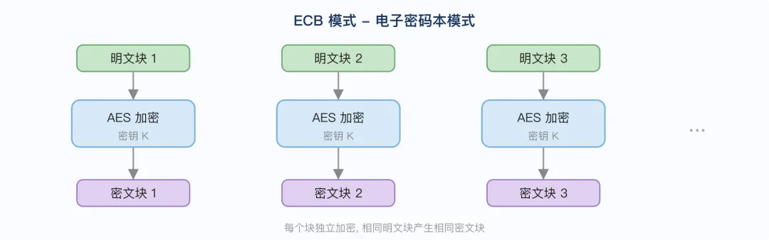 最简单的模式,每个 16 字节块独立加密,相同明文块产生相同密文块。