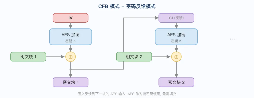 CBC模式原理图特点:需要 IV,且 IV 应随机生成;解密可并行,加密串行。逆向特征:有 16 字节 IV,常见于 "AES/CBC/PKCS5Padding"。