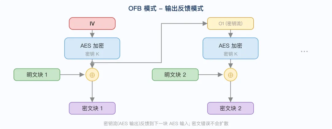 与 CFB 类似,但每次用密钥流而非密文作为下一轮输入: