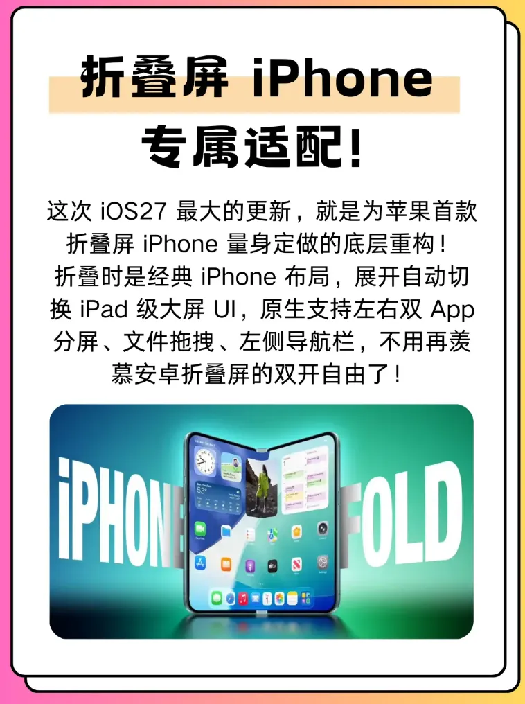 眼下具体怎么落地还悬着,交互怎么配合硬件团队怎么接招都要拍板,能参考的先例不多,按往年惯例,新系统多在 6 月 WWDC 亮相,iOS 27 看样子会是明年夏天的主角,分屏要是同步登场,对折叠屏 iPhone 的体验是加分项,初期大概率优先在折叠机型上开,直板机的节奏另算。