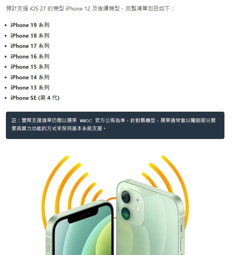 NPU算力高度紧密依靠iOS 27的核心功能,A13以及更早的芯片很有可能不再符合适配要求,预估支持范围包含iPhone 12以及后续所有机型,这里面有iPhone 13、14、15、16、17全系列,还有第四代iPhone SE。