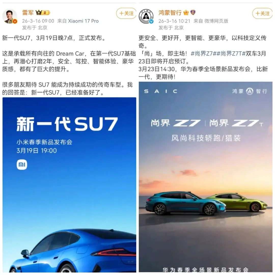 雷军9点刚发完微博官宣新一代SU7将于3月19日晚7点发布,紧接着10点21分,鸿蒙智行就甩出了尚界Z7/Z7T的预订预告,连文案都带着针锋相对的味道。