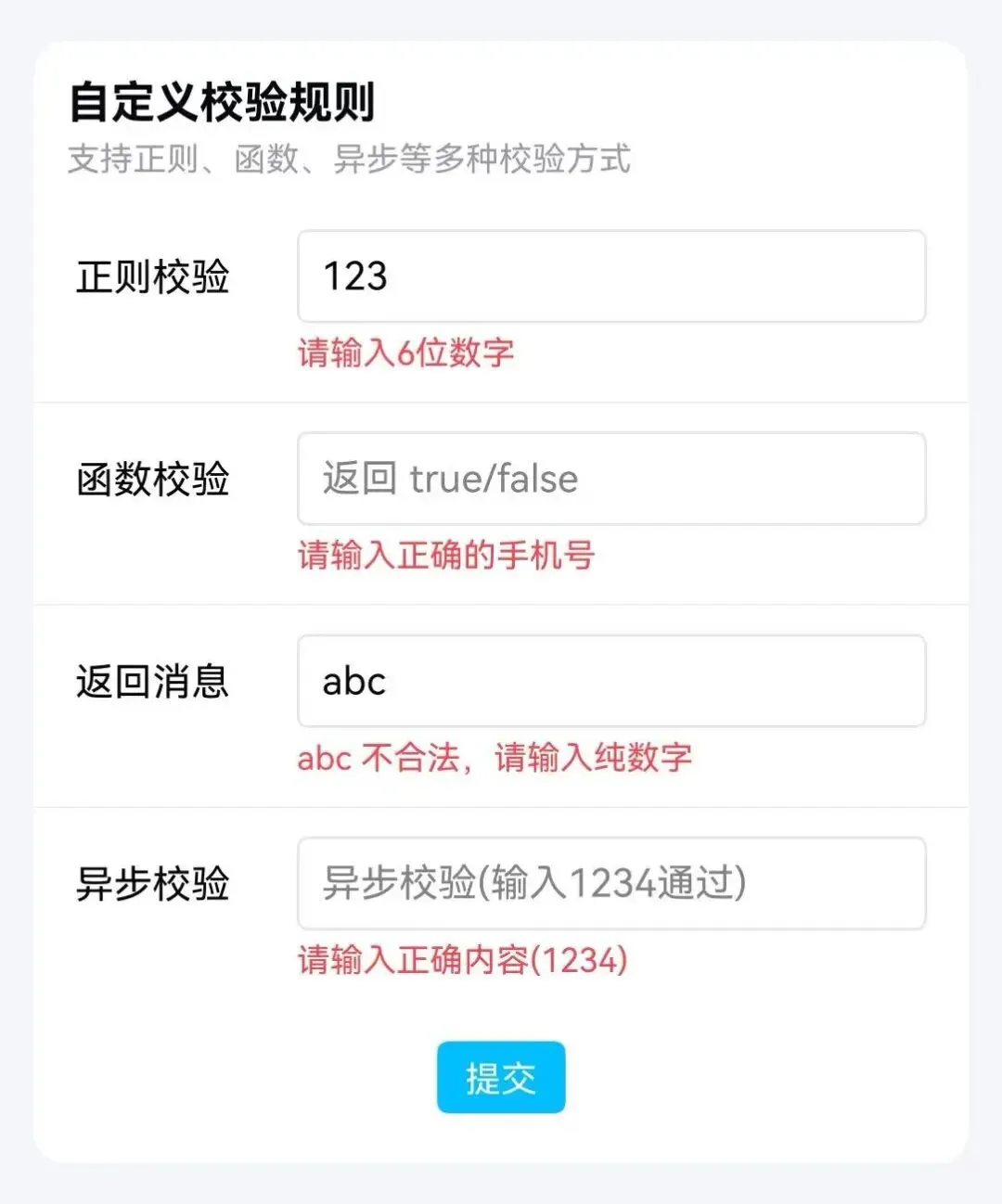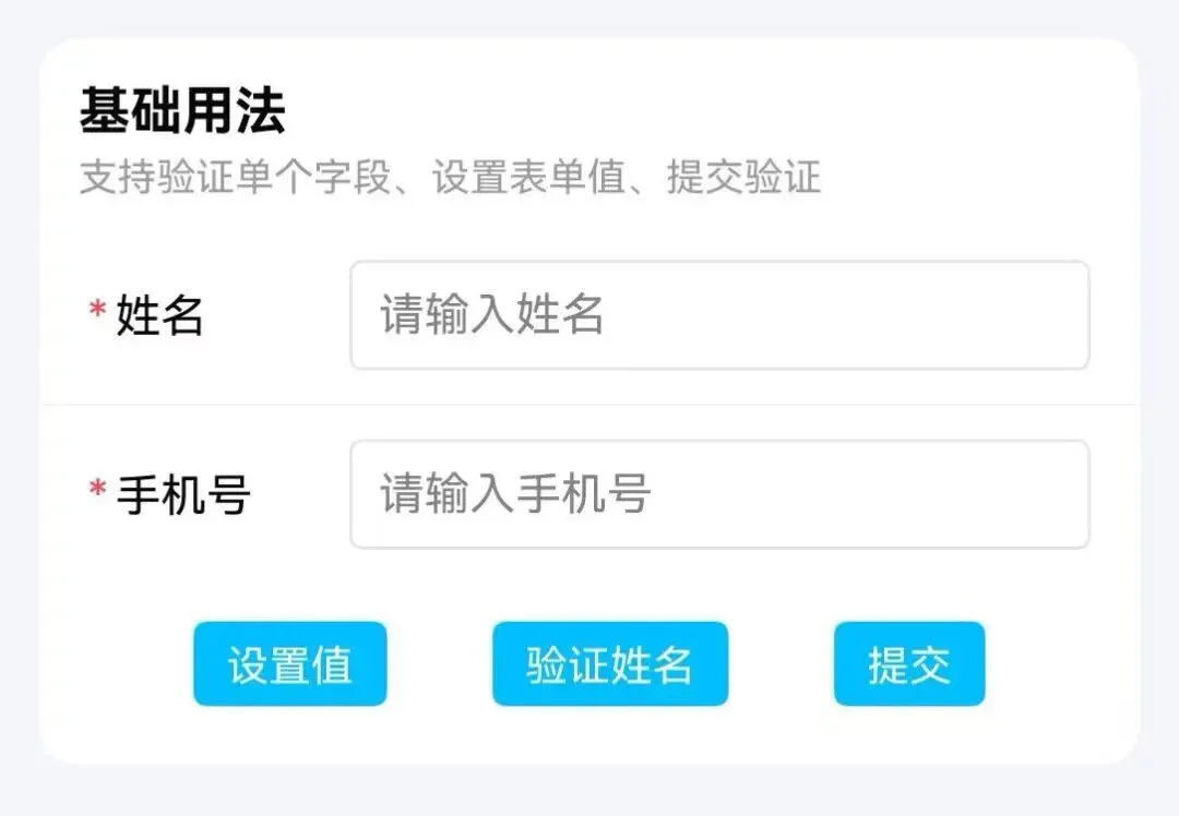 @Local formController: TnFormController = new TnFormController();@Local formData: Record<string, Object> = { username: "" as Object, phone: "" as Object,};Column() { TnForm({ controller: this.formController }) { TnFormItem({ prop: "username", label: "用户名", required: true, rules: [{ required: true, message: "请输入用户名" }], }) { TextInput({ placeholder: "请输入用户名" }) .onChange((value: string) => { this.formData["username"] = value as Object; }) } TnFormItem({ prop: "phone", label: "手机号", required: true, rules: [{ required: true, message: "请输入手机号" }], }) { TextInput({ placeholder: "请输入手机号" }) .onChange((value: string) => { this.formData["phone"] = value as Object; }) } } Row({ space: 10 }) { TnButton({ content: "重置全部", type: "info", onBtnClick: () => { this.formController.resetValidation(); }, }) TnButton({ content: "重置用户名", type: "info", onBtnClick: () => { this.formController.resetValidation("username"); }, }) }}