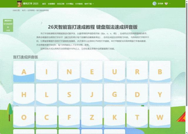 第15周会教授一些非常实用的输入法“隐藏技巧”,例如用“v”键快速输入数学符号,用“u”键打出生僻字,这些技巧能极大提升日常打字效率。随后的几周,学习者将挑战43篇精选美文,内容涵盖春天、亲情等主题,在打字的同时提升阅读能力和语感。最后通过整段文字的输入练习,全面巩固所学技能。