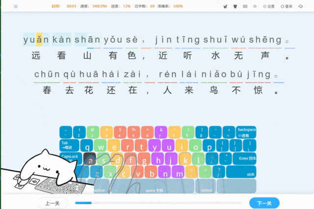 从第8周开始,正式进入拼音学习。先系统复习声母和韵母,再练习a-z的各种组合,帮助学习者找回拼音语感。第10周开始进行拼音输入实战,第11周更是别出心裁,将“床前明月光”等古诗融入练习,让学习者在优美的背景音乐中边打边学,趣味盎然。第12至14周则聚焦于常用词组(如“你好”、“谢谢”)和网络热词的练习,帮助学习者从“单字蹦”过渡到“词语流”,打字速度实现质的飞跃。