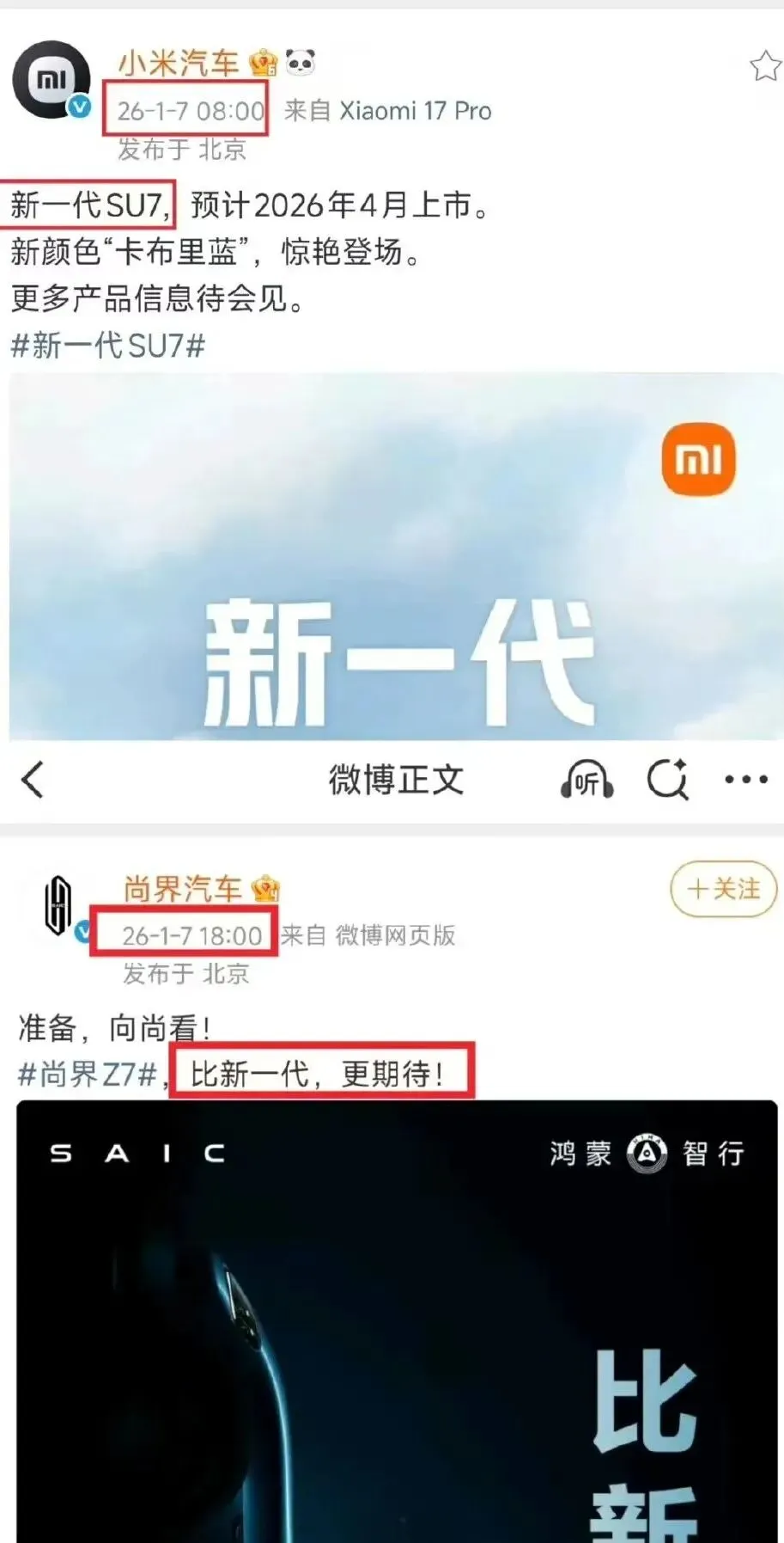 说真的,鸿蒙智行这波贴脸开大,早就不是第一次了,主打一个“小米出啥,我跟啥”,精准碰瓷不手软。小米刚官宣新一代SU7,尚界Z7转头就甩文案:“比新一代,更期待”,明着跟小米叫板,一点不藏着掖着。后来小米发冬测动态,喊“从容驾驭,精准稳定”,尚界Z7跟得比谁都快,玩起文字游戏:“从容,是本能,稳定,是天赋”,蹭热度的速度,比小米新车提速还猛。到了今天3月16日,雷军刚发完新一代SU7的官宣博文,还不到俩小时,鸿蒙智行又贴上来了。文案直接照搬小米的“安全、智能、豪华”,就加了个“更”字,结尾还补一句“比新一代,更期待”,明摆着就是照着小米的脸打,主打一个“你说啥,我比你更啥”。先不骂也不吹,客观说:这套当年荣耀对标小米的打法,短期有用,能蹭到流量、刷到存在感,毕竟互联网时代,吵起来就赢了一半。但问题是,汽车不是手机,这套玩烂了的营销套路,放到汽车圈,就是把双刃剑——产品力够硬,是“精准狙击”。产品力拉胯,就是“主动送人头”,最后只能沦为小米的背景板,纯属陪跑。很多人没搞懂,为啥手机那套对标打法,到汽车这儿就不好使了?核心就一个:手机和汽车的内核,压根不是一回事,别拿数码圈的逻辑,来硬套汽车圈的玩法,纯属自欺欺人。手机是啥?几千块的快消品,冲动消费就行。看个参数、刷个颜值、听两句营销话术,脑子一热就买了,哪怕有点小毛病,大不了凑合用,不行就换,损失不大。当然咱也不否认,手机的产品力也重要,没点真东西根本站不住脚,但说实话,营销玩得溜,才更容易收割流量、赚快钱——就比如某款很火的680机型,产品力不算顶尖,却靠铺天盖地的营销,赚足了眼球、割了一波又一波韭菜,这就是营销的威力。但汽车呢?二三十万起步,是普通人家里的大件消费,谁也不会脑子一热就下单。用户买的不是参数,是安全感。不单单要颜值,还要耐久度。不是营销话术,是底盘调校、车身用料、三电可靠性。你敢说一句“更安全”,用户就得要实打实的证据,毕竟这玩意儿载着一家人的命,容不得半点虚的。简单总结:手机比“嘴炮”,汽车比“硬活”。手机营销能救场,汽车营销只能铺路,真要赢,还得靠产品力说话。既然鸿蒙智行敢贴脸小米,就别光玩嘴炮,咱给尚界Z7支三招,不玩虚的,每一招都往小米的七寸上打,只要做到位,嘎嘎乱杀不是梦。第一招:去跑24小时耐力赛,别光吹参数,拉出来遛遛