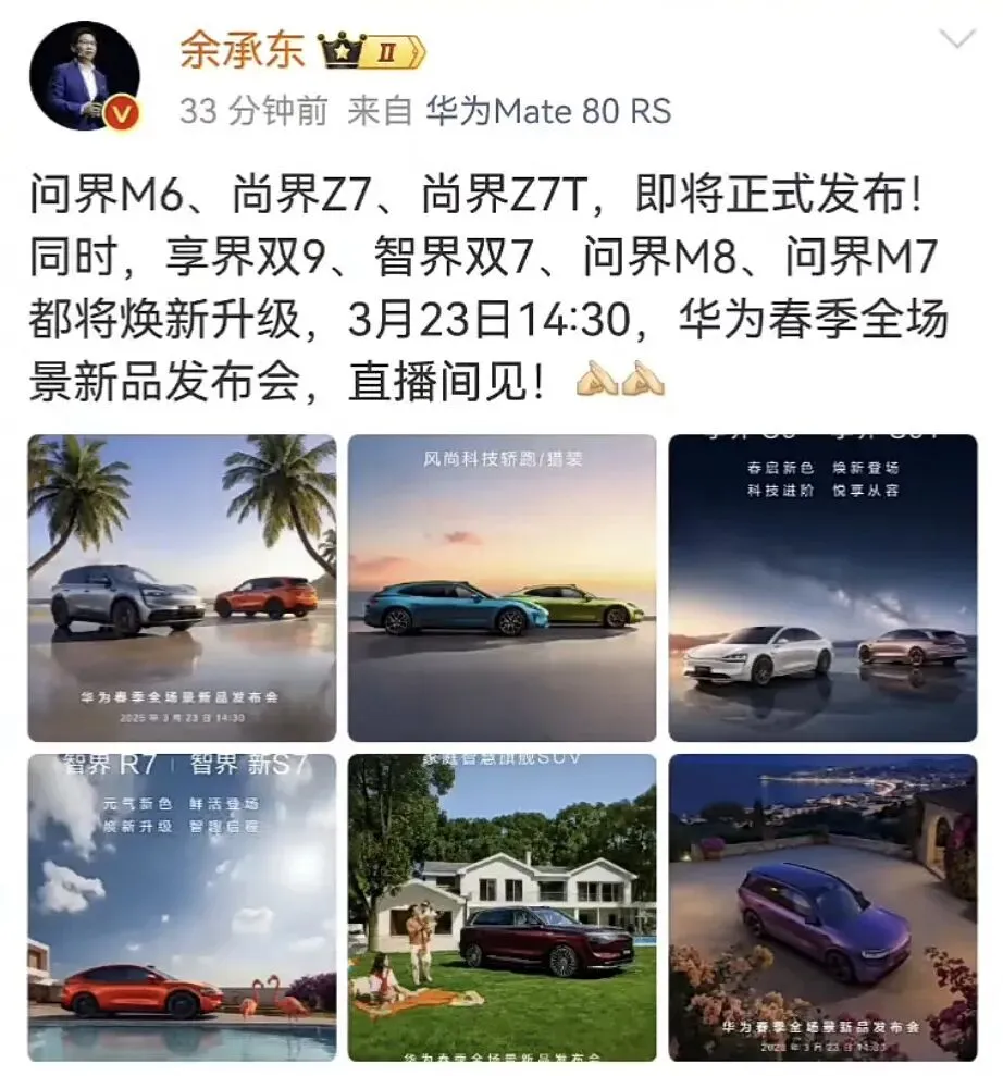 小米这边预售22.99-30.99万,主打性能、长续航与智能生态,准备靠升级款稳住市场。华为这边丝毫不拖,尚界Z7、问界M6、智界S7集体定在3月23日发布,和小米SU7仅差4天,价位、级别高度重合,直接抢同一批用户。