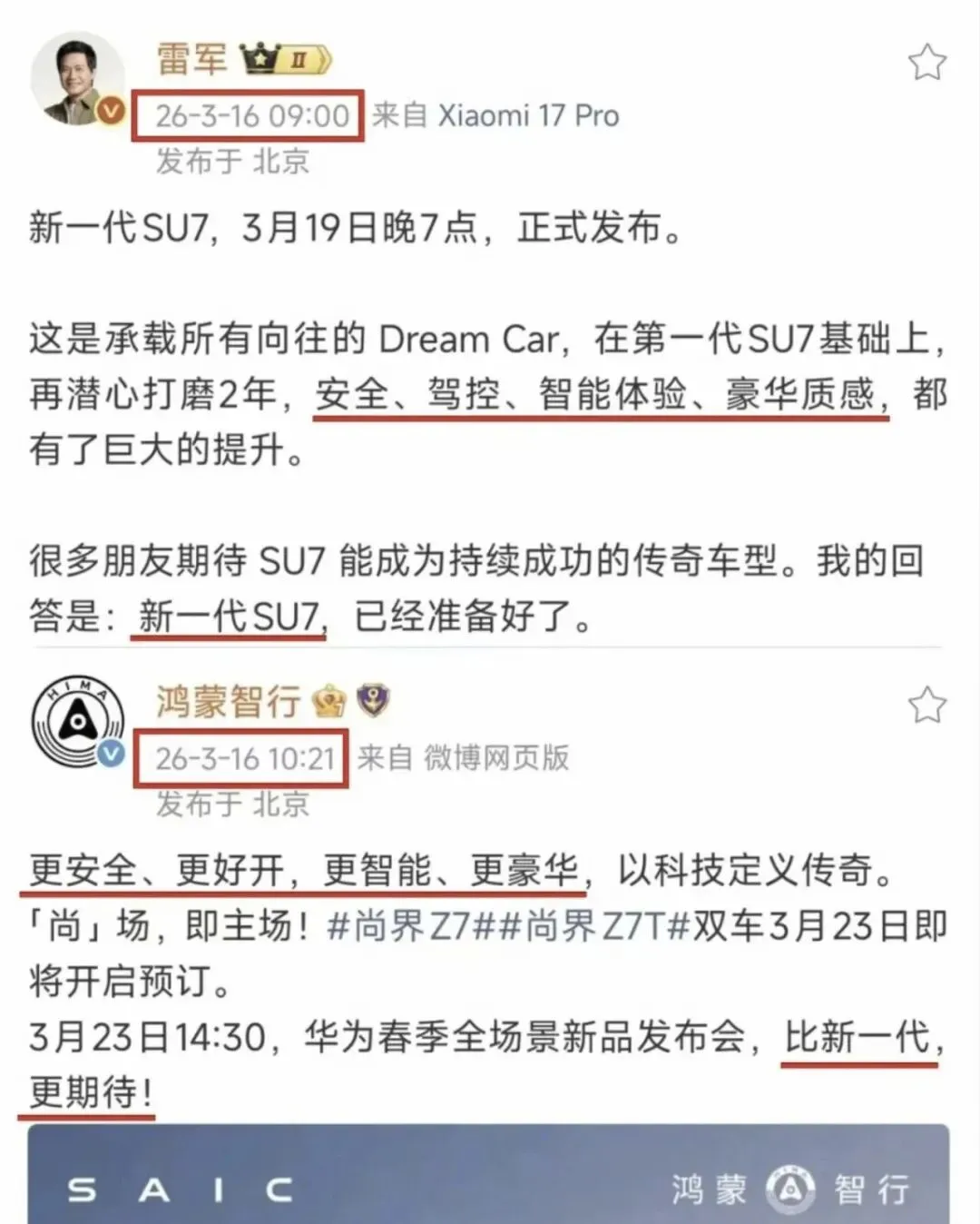3月16日车圈彻底炸锅,雷军刚官宣新一代小米SU7定档3月19日19:00发布,鸿蒙智行立马跟上,同一天官宣三款新车定档,摆明了贴身硬刚。