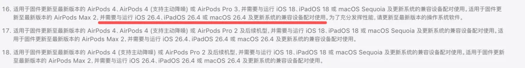 从官网小字可以得知,新款 AirPods Max 2 最低支持系统为 iOS26.4,所以也就是说,如果你打算入手这款新耳机,那么必须得升级 iOS 26.4 系统才能正常使用。
