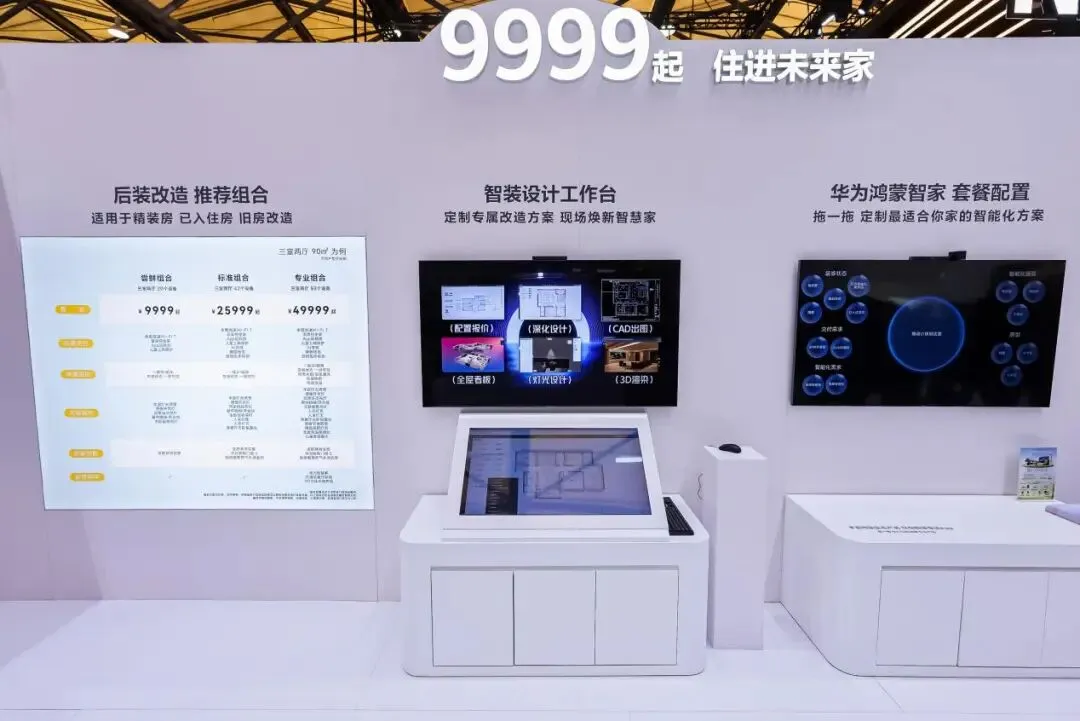 针对智能家居市场安装复杂、价格高昂的普及障碍,华为鸿蒙智家以后装模式切入存量市场,推出“不破墙、免布线”的后装解决方案,打造9999元起的尝鲜组合、25999元起的标准组合、49999元起的专业组合,同时推出百元级智装入门套装,将解决方案产品化、价格透明化,以优质的质价比推动全屋智能走向大众消费市场。