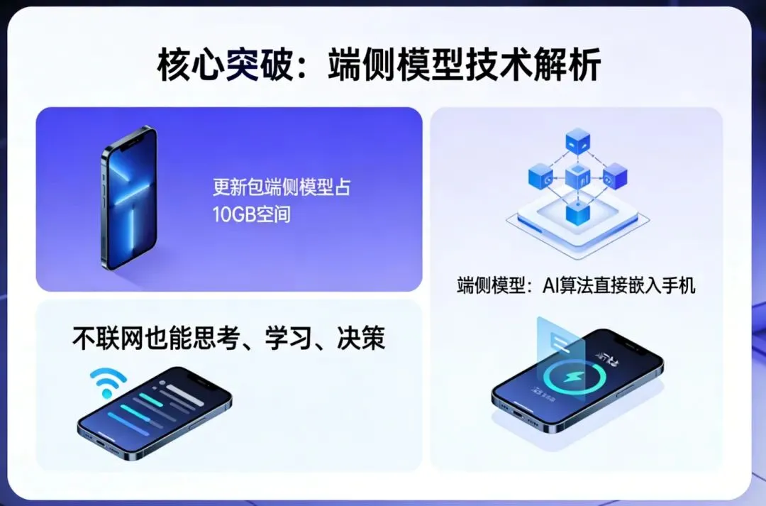 核心突破:这次更新包中,端侧模型占据了约10GB空间。所谓端侧模型,就是把AI算法模型直接“塞”进你的手机里,让它不联网也能思考、学习、决策。