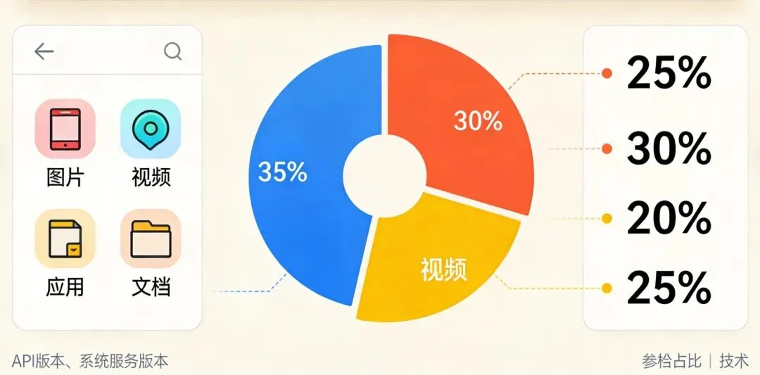核心突破:存储界面现在可以可视化展示图片、视频、应用、文档占比-,一目了然。取消了API版本、系统服务版本这些普通用户看不懂的信息-,真正做到了“给用户看用户想看的”。