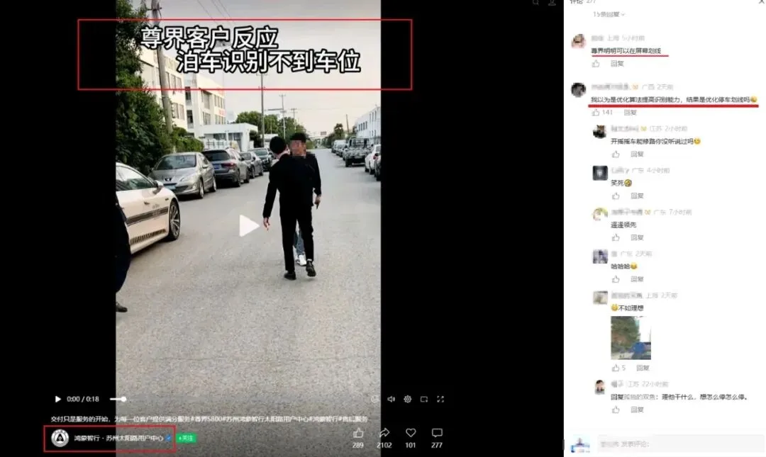 视频中刻意弱化车辆无车位线泊车能力,用“送划线”博眼球,不仅被网友吐槽“反向自黑”,更直接打脸官方宣传的智能泊车技术,引发消费者对产品实力与门店营销合规性的双重质疑。
