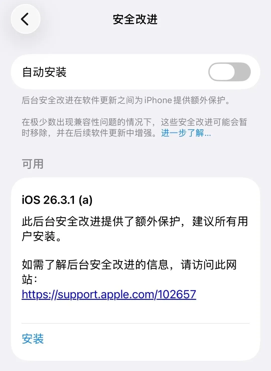 苹果今日凌晨发布了 iOS 26.3.1 (a) 安全改进更新,或者叫漏洞补丁。