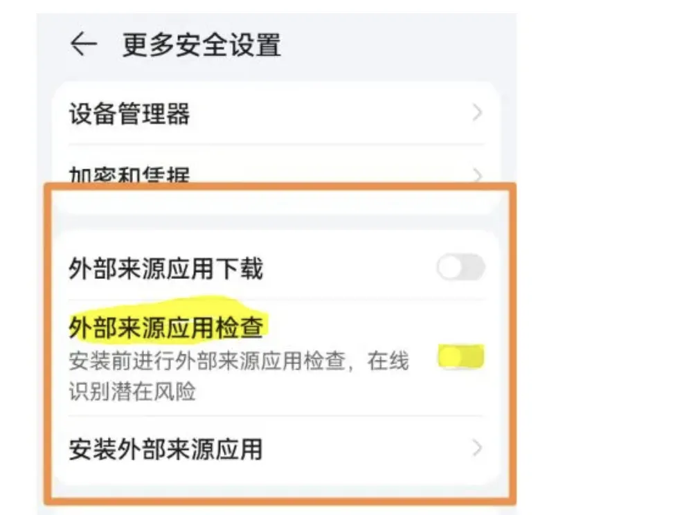 找到【外部来源应用检查】关闭此功能