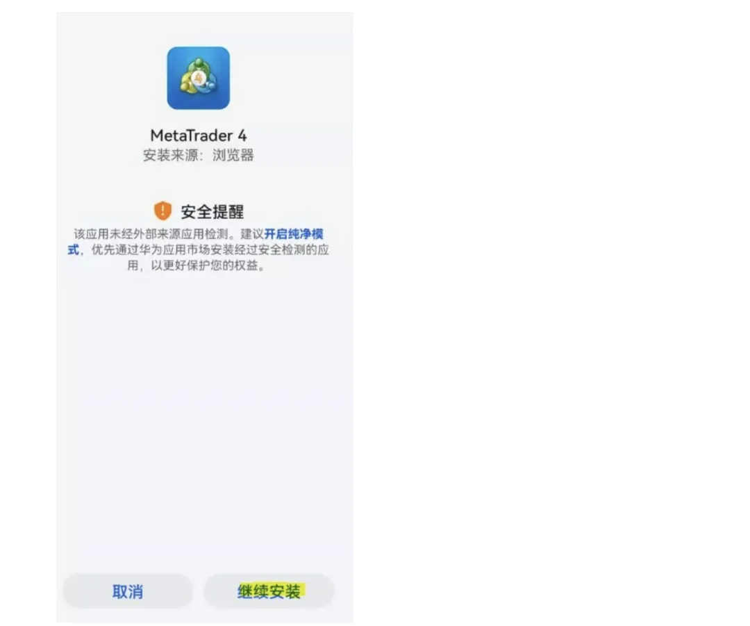 下面是MT4手机平台的安装界面,请选择【继续安装】即可。