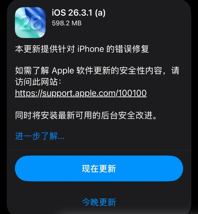 今天打开iPhone,习惯性点进【设置】-【通用】-【软件更新】,结果屏幕上冷冷清清,就一行字:“iOS 26.3.1 已是最新版本”。